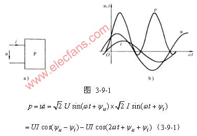 。圖3-9-1b為端口電壓u、端口電流i與瞬時功率p的波形圖。瞬時功率在某些時間段為正值,表示此時一端口網(wǎng)絡(luò)正在吸收功率。在某些時間段為負(fù)值,表示網(wǎng)絡(luò)在輸出功率,將原來儲存的能量送回電網(wǎng)。