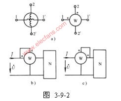 測量一端口網(wǎng)絡(luò)的功率時,電路連接如圖3-9-2b所示。將電流線圈串入被測量的電路,電壓線圈與端口并聯(lián)。二組線圈中分別流過電流,并產(chǎn)生磁場。功率表的讀數(shù)等于加在電壓線圈上的電壓有效值和通過電流線圈的電流有效值的乘積,再乘以電壓相量(參考方向從星號指向非星號)和電流相量(參考方