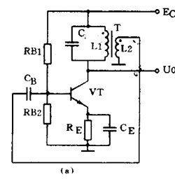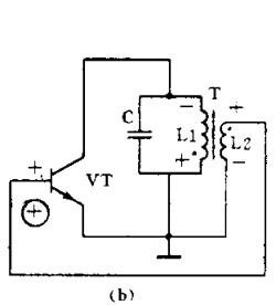 圖 1 ( a )是變壓器反饋 LC 振蕩電路。晶體管 VT 是共發(fā)射極放大器。變壓器 T 的初級是起選頻作用的 LC 諧振電路,變壓器 T 的次級向放大器輸入提供正反饋信號。接通電源時, LC 回路中出現(xiàn)微弱的瞬變電流,但是只有頻率和回路諧振頻率 f 0 相同的電流才能在回路兩端產(chǎn)生較高的電壓,這個電壓通過變壓器初次級 L1 、 L2 的耦合又送回到晶體管 V 的基極。從圖 1 ( b )看到,只要接法沒有錯誤,這個反饋信號電壓是和輸入信號電壓相位相同的,也就是說,它是正反饋。因此電路的振蕩迅速加強并最后穩(wěn)定下來。