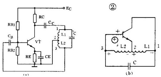 圖 2 ( a )是另一種常用的電感三點式振蕩電路。圖中電感 L1 、 L2 和電容 C 組成起選頻作用的諧振電路。從 L2 上取出反饋電壓加到晶體管 VT 的基極。從圖 2 ( b )看到,晶體管的輸入電壓和反饋電壓是同相的,滿足相位平衡條件的,因此電路能起振。由于晶體管的 3 個極是分別接在電感的 3 個點上的,因此被稱為電感三點式振蕩電路。