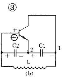 還有一種常用的振蕩電路是電容三點式振蕩電路,見圖 3 ( a )。圖中電感 L 和電容 C1 、 C2 組成起選頻作用的諧振電路,從電容 C2 上取出反饋電壓加到晶體管 VT 的基極。從圖 3 ( b )看到,晶體管的輸入電壓和反饋電壓同相,滿足相位平衡條件,因此電路能起振。由于電路中晶體管的 3 個極分別接在電容 C1 、 C2 的 3 個點上,因此被稱為電容三點式振蕩電路。