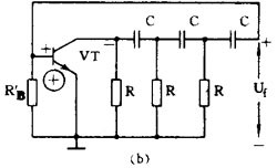 圖 4 ( a )是 RC 相移振蕩電路。電路中的 3 節(jié) RC 網(wǎng)絡(luò)同時起到選頻和正反饋的作用。從圖 4 ( b )的交流等效電路看到:因為是單級共發(fā)射極放大電路,晶體管 VT 的輸出電壓 U o 與輸出電壓 U i 在相位上是相差 180° 。當輸出電壓經(jīng)過 RC 網(wǎng)絡(luò)后,變成反饋電壓 U f 又送到輸入端時,由于 RC 網(wǎng)絡(luò)只對某個特定頻率 f 0 的電壓產(chǎn)生 180° 的相移,所以只有頻率為 f 0 的信號電壓才是正反饋而使電路起振??梢?RC 網(wǎng)絡(luò)既是選頻網(wǎng)絡(luò),又是正反饋電路的一部分。