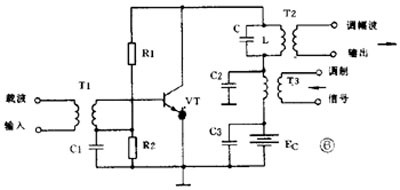 圖 6 是集電極調(diào)幅電路,由高頻載波振蕩器產(chǎn)生的等幅載波經(jīng) T1 加到晶體管基極。低頻調(diào)制信號則通過 T3 耦合到集電極中。 C1 、 C2 、 C3 是高頻旁路電容, R1 、 R2 是偏置電阻。集電極的 LC 并聯(lián)回路諧振在載波頻率上。如果把三極管的靜態(tài)工作點選在特性曲線的彎曲部分,三極管就是一個非線性器件。因為晶體管的集電極電流是隨著調(diào)制電壓變化的,所以集電極中的 2 個信號就因非線性作用而實現(xiàn)了調(diào)幅。由于 LC 諧振回路是調(diào)諧在載波的基頻上,因此在 T2 的次級就可得到調(diào)幅波輸出。