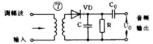圖 7 是一個二極管檢波電路。 VD 是檢波元件, C 和 R 是低通濾波器。當輸入的已調(diào)波信號較大時,二極管 VD 是斷續(xù)工作的。正半周時,二極管導(dǎo)通,對 C 充電;負半周和輸入電壓較小時,二極管截止, C 對 R 放電。在 R 兩端得到的電壓包含的頻率成分很多,經(jīng)過電容 C 濾除了高頻部分,再經(jīng)過隔直流電容 C 0 的隔直流作用,在輸出端就可得到還原的低頻信號。