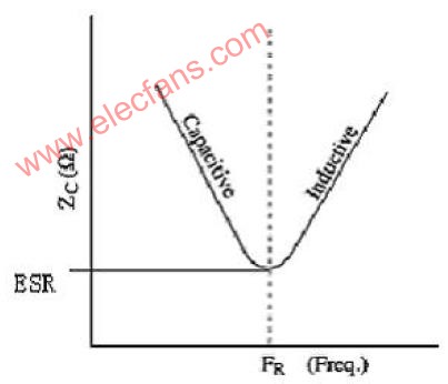 4 在實(shí)際電容器的頻率曲線上,諧振頻率點(diǎn)f0時(shí)得到阻抗的最小值,稱此頻率點(diǎn)為自諧振頻率,該點(diǎn)的阻抗值為等效串聯(lián)阻抗ESR的大小。頻率低于f0,器件顯電容特性;頻率高于f0,器件顯電感特性。