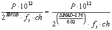 以上數(shù)式中的功率和頻率均采用國(guó)際系統(tǒng)單位,計(jì)算結(jié)果的單位為pJ/轉(zhuǎn)換。在上述公式中,P代表器件或系統(tǒng)消耗的功率,單位為瓦(W),而ENOB代表轉(zhuǎn)換器或轉(zhuǎn)換系統(tǒng)的有效轉(zhuǎn)換位數(shù),fs則代表最大采樣頻率(Hz)。至于ch值則表示轉(zhuǎn)換器中將所有值規(guī)格化為一個(gè)單通道的通道數(shù)量。在這方面的計(jì)算,可能需要使用到SINAD的數(shù)值(如第二個(gè)公式所示):