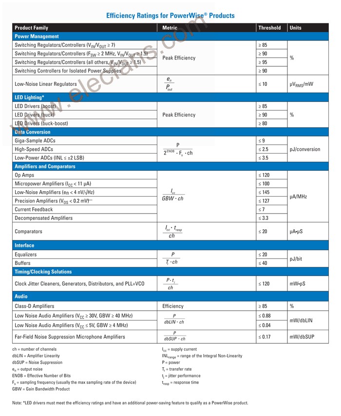 隨著人們對(duì)器件的能源效益要求更高,往往也要求采用上述類似的方法來(lái)確定部件或系統(tǒng)的最佳性能/功率比。為此,美國(guó)國(guó)家半導(dǎo)體建立起一個(gè)產(chǎn)品性能指標(biāo)作為測(cè)量器件功耗和性能水平的方法,而只有處于這些指標(biāo)上層的產(chǎn)品才能成為PowerWise?產(chǎn)品系列的成員。表1中列舉了各組件系列以及其相關(guān)的指標(biāo)和性能闕值,這些數(shù)據(jù)可幫助設(shè)計(jì)人員選出最高性能/功率比的產(chǎn)品。