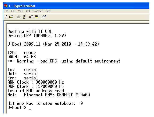 重新上電,從圖 5啟動(dòng)信息可見沒有 UBL的運(yùn)行信息,是直接從 UBoot運(yùn)行的。