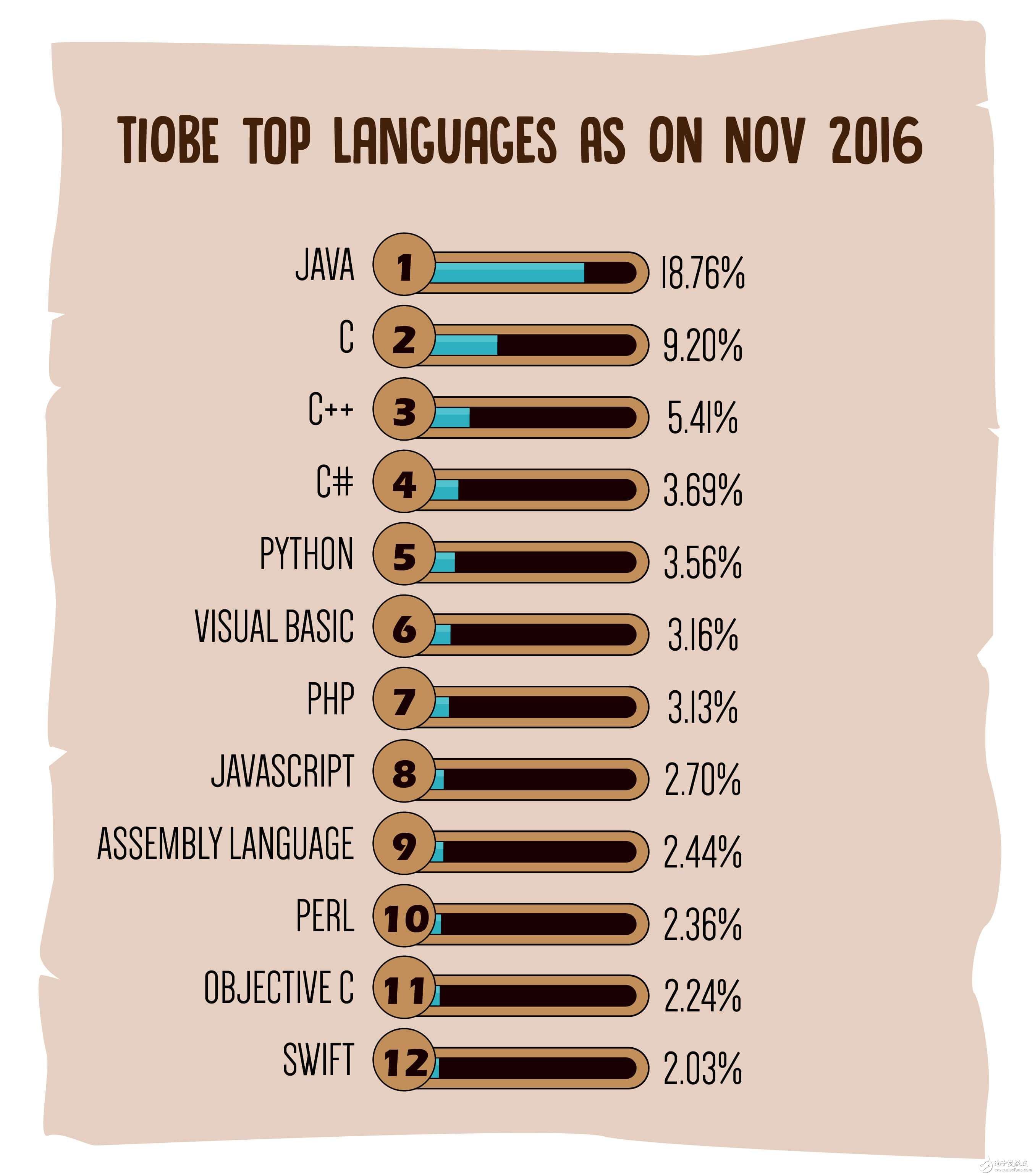 該排行榜排名基于全球有經(jīng)驗(yàn)的工程師、課程和第三方廠商的數(shù)量。根據(jù)知名搜索引擎(諸如 Google、MSN、Yahoo!、Wikipedia、YouTube 以及 Baidu 等)進(jìn)行計(jì)算各編程語(yǔ)言的流行度占比(Rating)。