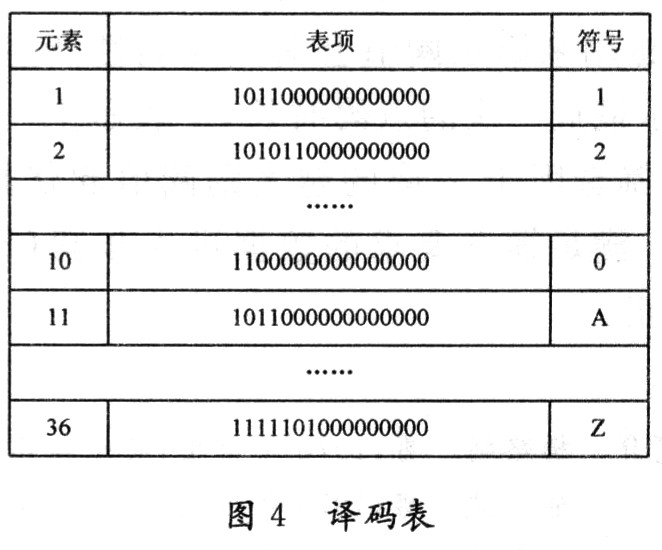 ??? 莫爾斯碼中的字符由一系列點(diǎn)、劃信號(hào)的組合惟一表示。算法中采用改進(jìn)的查表法來進(jìn)行莫爾斯碼的譯碼。設(shè)計(jì)一個(gè)定長表,將莫爾斯碼放入表項(xiàng)值中。由于莫爾斯碼中長碼、短碼的長度不一,為了方便比較為每項(xiàng)預(yù)留16 b,用10表示點(diǎn)碼,用11表示劃碼,剩余用OO補(bǔ)齊,如圖4所示。
