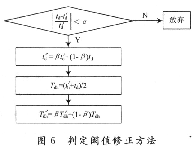 ??? (1)判斷最近一次點(diǎn)碼時(shí)長是否符合篩選要求。因?yàn)榇a文中總有一些出錯(cuò)的或時(shí)長相差較大的,如果將這些時(shí)長也用來修正閾值會(huì)對(duì)其準(zhǔn)確性產(chǎn)生較大的影響。t′d表示最近一次的點(diǎn)碼時(shí)長,t′d表示上一次的點(diǎn)碼時(shí)長,a為篩選因子。a取的越大則閾值起伏越大,此處取為O.5。滿足篩選要求的數(shù)據(jù)進(jìn)入步驟(2),否則放棄本次修正。