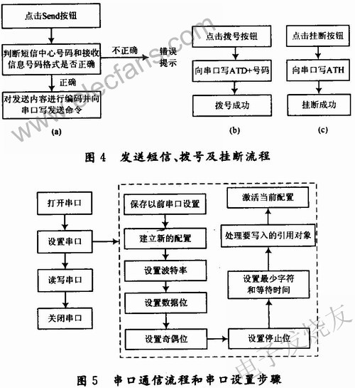 當(dāng)需要發(fā)送短信或撥號時(shí),應(yīng)用程序流程如圖4所示。當(dāng)用戶調(diào)用發(fā)信界面編輯好短信,并輸入完收信方,點(diǎn)擊發(fā)送鈕時(shí),應(yīng)用程序首先判斷短信中心號碼和接收信息號碼是否正確,若不正確,提示用戶錯(cuò)誤;若號碼和號碼格式均正確,便對要發(fā)送的短信內(nèi)容按照進(jìn)行PDU短信格式進(jìn)行編碼,并向串口寫AT命令以便將該短信發(fā)送出去。撥號和掛斷電話的流程很簡單,只需要向串口寫入ATD+所撥號碼以及ATH就可,當(dāng)撥號錯(cuò)誤時(shí),提示用戶撥號錯(cuò)誤。