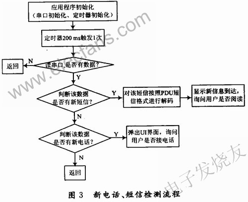 新電話、新短信的檢測流程如圖3所示,應(yīng)用程序初始化需要對GSM/GPRS通信模塊與應(yīng)用處理器之間的接口進(jìn)行初始化,此外還要定義1個(gè)200 ms觸發(fā)的定時(shí)器。系統(tǒng)初始化完畢之后,定時(shí)器觸發(fā)開始讀串口數(shù)據(jù)進(jìn)行判斷。當(dāng)串口無數(shù)據(jù)時(shí),等待下一次定時(shí)器出發(fā);當(dāng)串口有數(shù)據(jù)時(shí),將串口的數(shù)據(jù)進(jìn)行判斷;當(dāng)數(shù)據(jù)中有新短信提示符時(shí),按照PDU短信的解碼格式對該短信進(jìn)行解碼,并調(diào)用UI界面提示用戶新短信到達(dá),詢問用戶是否閱讀;當(dāng)數(shù)據(jù)中有新電話提示符時(shí),調(diào)用UI界面,詢問用戶是否接聽。
