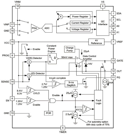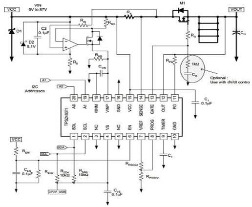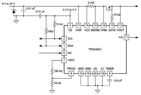 TPS233X熱插拔控制器有幾個(gè)引腳連接到電源總線在一個(gè)典型的應(yīng)用。