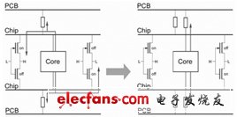 EME優(yōu)化退耦目標(biāo)是通過(guò)一個(gè)或更多的去耦電容提供一個(gè)最高所需高頻電流。高頻電流存放在片上的開(kāi)關(guān)電路中環(huán)路越多和電容越低對(duì)其它供電電路影響較大。為優(yōu)化連接線路的阻抗,通常電容盡可能接近MCU的供電引腳。為減少電流環(huán)路輻射,應(yīng)當(dāng)減少環(huán)路面積。僅用PCB設(shè)計(jì)技術(shù)難以實(shí)現(xiàn)最大程度的改善。因此,慣用對(duì)策是將部分去耦電容放到芯片內(nèi)部從而減少連接阻抗,并且適當(dāng)?shù)目紤]電流回路面積,這些片上電容太小以至不能提供整個(gè)芯片去耦,所以PCB上的電容仍是必要的,然而,對(duì)于較高的頻率范圍,它們可以很好地減少輻射。