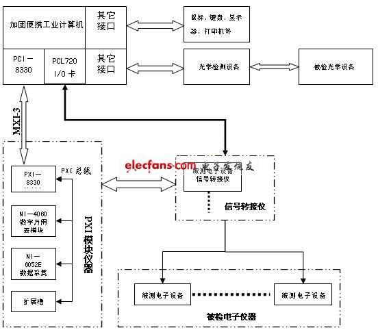 電子檢測設備主要由PXI模塊儀器、PCL720數(shù)字I/O模塊、信號轉(zhuǎn)接儀和其它附件、電纜組成,其中PXI模塊儀器包括PXI-1002機箱、MXI-3控制套件和PXI-6052E多功能數(shù)據(jù)采集模塊