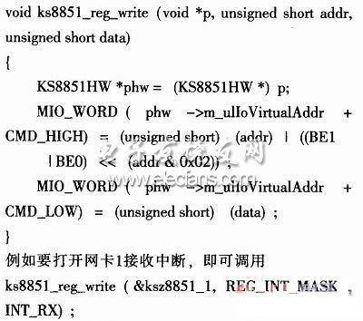 4618 TCP/IP協(xié)議棧在很多應(yīng)用中已經(jīng)證明了其穩(wěn)定性,所以在實(shí)際應(yīng)用中主要解決移植和編寫網(wǎng)卡的底層驅(qū)動(dòng)程序的問題,本文討論的是MICREL網(wǎng)卡驅(qū)動(dòng)在HEROS系統(tǒng)中的實(shí)現(xiàn),該款芯片為8851,有兩個(gè)完全獨(dú)立的網(wǎng)卡電路實(shí)現(xiàn)。