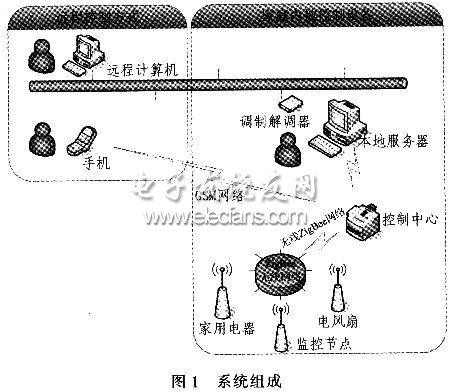 該系統(tǒng)設(shè)計(jì)由家庭內(nèi)被控制設(shè)備和遠(yuǎn)程控制設(shè)備組成。其中家庭內(nèi)被控制設(shè)備主要有能訪問(wèn)Internet的計(jì)算機(jī)、控制中心、監(jiān)控節(jié)點(diǎn)和選擇添加的家用電器控制器。遠(yuǎn)程控制設(shè)備主要由遠(yuǎn)程計(jì)算機(jī)和手機(jī)組成。系統(tǒng)組成如圖1所示。