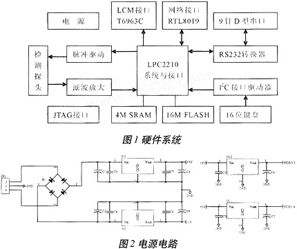 ??? 整個(gè)硬件系統(tǒng)由腦血氧檢測(cè)探頭脈沖驅(qū)動(dòng)電路、濾波放大電路、LPC2210系統(tǒng)及接口電路組成。由LPC2210產(chǎn)生PWM脈寬調(diào)制信號(hào),經(jīng)探頭脈沖驅(qū)動(dòng)電路放大,用于驅(qū)動(dòng)探頭的光源發(fā)光,并產(chǎn)生周期性的光信號(hào)。探頭中的光電傳感器采集含有腦組織血氧信息的光信號(hào),經(jīng)光電轉(zhuǎn)換產(chǎn)生電信號(hào)。濾波放大電路將得到的電信號(hào)進(jìn)行低通濾波和信號(hào)放大。LPC2210對(duì)放大后的信號(hào)進(jìn)行A/D轉(zhuǎn)換,并進(jìn)行數(shù)字處理,同時(shí)通過(guò)接口電路擴(kuò)展鍵盤(pán)、LCM圖形液晶顯示、RS232串口和以太網(wǎng)接口,用于整個(gè)系統(tǒng)的控制、顯示、與上位機(jī)(PC機(jī))的通訊以及網(wǎng)絡(luò)通信。其系統(tǒng)框圖如圖1所示。