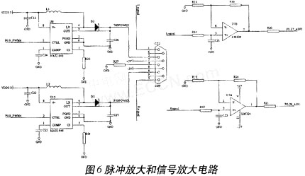 ??? 腦血氧探頭部分的前置放大電路需要系統(tǒng)提供+5V和-5V電源,同時(shí)燈泡需要提供電壓大約為9V、周期為4s、占空比為1/3的脈沖方波,以實(shí)現(xiàn)760nm和850nm兩個(gè)光源輪流發(fā)光和檢測(cè)到響應(yīng)的背景噪聲。脈沖方波可以由LPC2210的PWM實(shí)現(xiàn),可是其輸出電壓為3.3V,不足以驅(qū)動(dòng)探頭燈泡發(fā)光,因此采用了開(kāi)關(guān)模式電壓轉(zhuǎn)換器MAX1848,它產(chǎn)生最高至13V的輸出電壓,足以驅(qū)動(dòng)小燈泡。通過(guò)燈泡的正向電流與加在CTRL引腳的電壓成正比,將LPC2210的P0.9和P0.8定義成PWM狀態(tài),通過(guò)軟件使其產(chǎn)生上述的脈沖方波,接在CTRL上。當(dāng)加載在CTRL上的電壓小于100mV時(shí),MAX1848會(huì)進(jìn)入關(guān)斷模式,這樣可以實(shí)現(xiàn)PWM調(diào)光功能。探頭與系統(tǒng)電路之間采用了標(biāo)準(zhǔn)的9針接口,方便組裝和拆卸。放大電路如圖6所示。