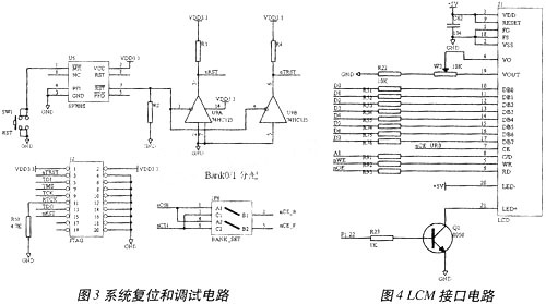 ??? 本系統(tǒng)的復(fù)位電路使用了SP708S,由于在進(jìn)行JTAG調(diào)試時(shí)nRST和nTRST可由JTAG仿真器控制復(fù)位,因此使用了三態(tài)緩沖門(mén)74HC125進(jìn)行驅(qū)動(dòng),如圖3所示。系統(tǒng)時(shí)鐘電路采用了外部11.0592MHz晶振,使串口波特率更精確,同時(shí)能夠支持LPC2210片內(nèi)PLL功能,用1M電阻R45并接到晶振兩端,使系統(tǒng)容易起振。JTAG接口電路采用了ARM公司提出的標(biāo)準(zhǔn)20腳JTAG仿真調(diào)試接口,其信號(hào)的定義與LPC2210的連接電路如圖3所示。根據(jù)LPC2210的應(yīng)用手冊(cè)說(shuō)明,在RTCK引腳接一個(gè)4.7K的下拉電阻,使系統(tǒng)復(fù)位后,LPC2210內(nèi)部的JTAG接口使能,這樣就可以直接進(jìn)行JTAG仿真調(diào)試了。本系統(tǒng)擴(kuò)展了4MbSRAM(IS6ILV25616AL)和16MbFLASH(SST39VF160)。為了方便程序調(diào)試和固化, 使用了Bank0和Bank1的地址空間,可以通過(guò)跳線(xiàn)將LPC2210的CS0和CS1分別分配給SRAM或者FLASH。程序調(diào)試時(shí),分配SRAM為Bank0地址;最終代碼固化到FLASH時(shí),分配FLASH為Bank0地址。