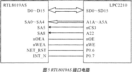 ??? 本系統(tǒng)設(shè)計(jì)了以RTL8019AS芯片為核心的以太網(wǎng)接口電路,其電路原理圖如圖5所示。由于LPC2210是開(kāi)放式總線(xiàn),所以電路設(shè)計(jì)為16位總線(xiàn)方式對(duì)RTL8019AS進(jìn)行訪問(wèn),數(shù)據(jù)總線(xiàn)D0~D15與芯片SD0~SD15連接。由于RTL8019AS的工作電壓是5V,而LPC2210的I/O電壓為3.3V,所以在總線(xiàn)上串接470Ω的保護(hù)電阻。RTL8019AS工作在跳線(xiàn)模式,基地址為0x300H,所以電路上SA6、SA7、SA10~SA19均接地,SA9接電源。SA8與地址總線(xiàn)A22相連,SA5與LPC2210的外部存儲(chǔ)器Bank3片選CS3相連,當(dāng)SA8為1,SA5為0時(shí),選中RTL8019AS。其它引腳的連接方法可參考RTL8019AS的應(yīng)用手冊(cè)。