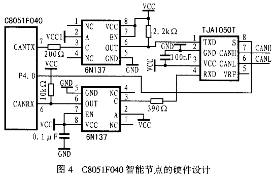 圖中,C8051F040的6、7腳分別為CANRX和CANTX引腳,CAN的輸出輸入必須加總線收發(fā)器才能與CAN物理總線相連。本系統(tǒng)采用了TJA1050高速CAN收發(fā)器來替代傳統(tǒng)的PCA82C250收發(fā)器,TJA1050芯片具有電磁輻射低、防短路、不上電時對總線無影響等特點,它的8腳S可以選擇高速或靜音兩種模式,并可由C8051F040的P4.0控制。為了增加CAN 節(jié)點的抗干擾能力,將CAN引腳通過高速光耦6N137與總線收發(fā)器相連,可實現各節(jié)點之間的電氣隔離。電源的隔離可以采用小功率電源隔離模塊,也可以用帶多個5V隔離輸出的開關電源模塊。這樣能大大提高節(jié)點的穩(wěn)定性和可靠性,但可能會增加節(jié)點的硬件復雜性。