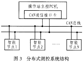 工業(yè)測控現場通常存在著大量的傳感器、執(zhí)行機構和電子控制單元,它們一般分布較廣,而且對實時性要求也很高,圖3是基于CAN總線的分布式測控系統(tǒng)框圖。該系統(tǒng)采用現場總線式集散系統(tǒng)FDCS?Field Distributed Control System?結構,它由主控站(注:CAN總線各節(jié)點并不分主從 ?這里是針對特定的系統(tǒng)而言)、C8051F040為MCU的智能節(jié)點并配以CAN現場總線控制網絡構成。主控站主要完成對各節(jié)點的在線監(jiān)控以及對各節(jié)點返回信息的分析處理,并對節(jié)點發(fā)出控制命令以控制節(jié)點工作模式。智能節(jié)點則根據主控站命令來完成數據采集、運行顯示以及對執(zhí)行部件的控制,以及各節(jié)點與主站、節(jié)點與節(jié)點之間的實時數據交換和信息控制。