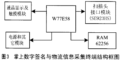 物流信息采集終端設計方案的結構框圖如圖3所示。設計方案的主要組成部分包括微處理器、掃描頭接口模塊(SE923HS)、液晶顯示及觸摸模塊以及外部的32KB RAM,還有電源模塊和微處理器監(jiān)控模塊等其它模塊。