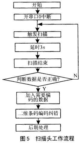 用SE923HS譯碼程序相對簡單。首先,設置好SE923HS與W77E58通信的波特率。然后,打開串口中斷,在需要掃描條碼時將P1.2置為低電平,進入3s的延時,掃描電機開始工作。在延時時間內,掃描頭一直處于工作狀態(tài),掃描頭譯碼后的數據輸入至單片機產生串口中斷,在中斷函數中存儲譯碼后的信息。一般來說,SE923HS掃描頭有效工作1s后可以將紙質的掃描譯碼完畢。P1.2置為高電平時,掃描電機停止工作。