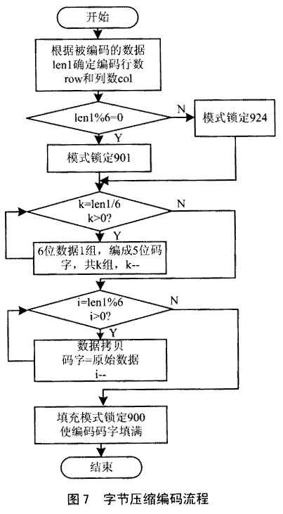 字節(jié)壓縮模式通過基256至基900的轉換,將字節(jié)序列轉換為碼字序列。當所要表示的字節(jié)總數不是6的倍數時,用模式鎖定901;當所要表示的字節(jié)總數是6的倍數時,用模式鎖定924。在應用模式鎖定924的情況下,6個字節(jié)可通過基256至基900的轉換用5個碼字表示,從左到右進行轉換。在應用模式鎖定901的情況下,每前6個字節(jié)的轉換方法與上述方法相同,對被6整除所剩余的字節(jié)應每個字節(jié)對應一個碼字,逐字節(jié)用碼字表示。具體編碼流程如圖7所示。