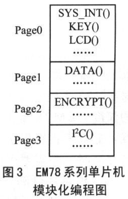 ??? 圖3中,PageO存放的主要是比較常用的子程序,如系統(tǒng)初始化程序、鍵盤掃描、液晶顯示等;Pagel存放的是一些數(shù)據(jù)處理程序,如不同Bank的數(shù)據(jù)拷貝,十六進制轉(zhuǎn)為二進制壓縮BCD碼等程序;Page2存放的加密算法程序,這是筆者項目開發(fā)中最重要的部分,所以單獨的放在一個Page內(nèi);Page3主要是對IC存儲器24LC02的一些讀寫操作子程序。這樣將功能相近的子程序放在一個Page內(nèi),從而根據(jù)單片機的結(jié)構(gòu)特點結(jié)合項目開發(fā)的實際來劃分程序存儲空間。在這樣調(diào)試時,很容易發(fā)現(xiàn)問題出現(xiàn)在哪個區(qū)域,使得程序結(jié)構(gòu)清晰明了,調(diào)用方便,易于調(diào)試和維護。