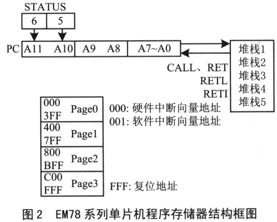 ??? 首先需要介紹一下EM 78系列單片機的程序存儲器ROM結(jié)構(gòu)。EM78系列的程序存儲器ROM容量為4K×13位,采用Page(“頁”)分配原則,就是將4K的程序空間分為4頁,每個頁容量為1K。其結(jié)構(gòu)如圖2所示,其中Page0(000H~3FFH)、Pagel(400H~7FFH)、Page2(800H~BFFH)、Page3(COOH~FFFH)。指令系統(tǒng)中的兩條長距離跳轉(zhuǎn)指令JMP和CALL,所攜帶的地址碼僅僅有l(wèi)O位,210=lK地址空間,即只能在1K的空間內(nèi)跳轉(zhuǎn)。當使用JMP指令時,裝入目標地址到PC程序指針的低10位;使用CALL指令時,裝入目標地址至PC程序指針的低10位,且PC+l壓棧,調(diào)用同1K頁面內(nèi)的任何程序。PC程序指針(寄存器R2)和堆棧的位數(shù)是12位,即尋址空間分別為4K,一個程序頁面為lK。頁面選擇通過設(shè)定狀態(tài)寄存器R3的Bit6(PS1)、Bit5(PSO)來完成。