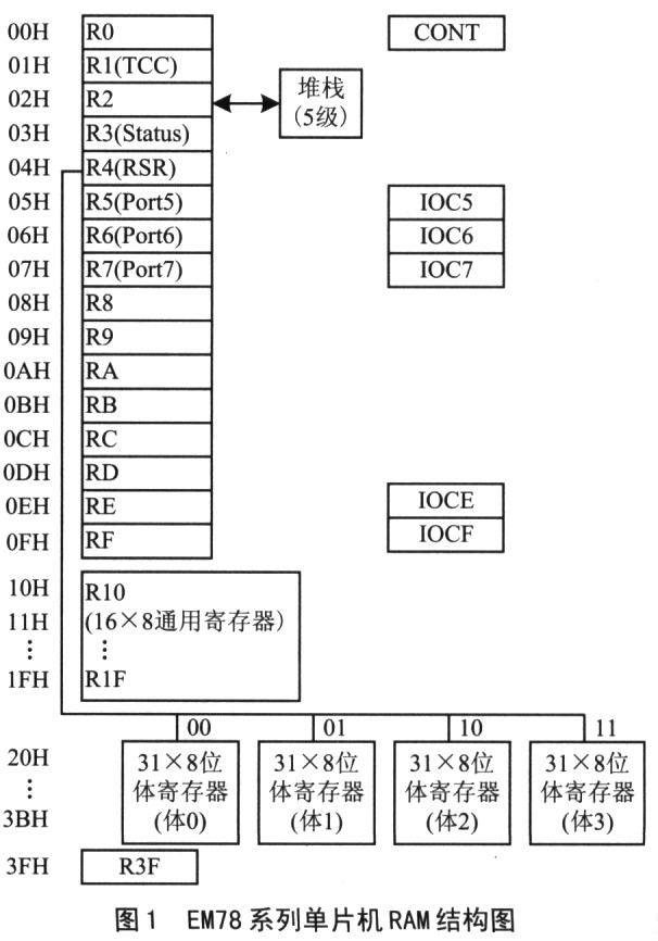 ??? EM78系列的RAM既可以認為是普通單片機中的RAM,也可以認為是寄存器(通用和專用寄存器)。以EM78P447為例,RAM共148×8位,其結(jié)構(gòu)如圖1所示。