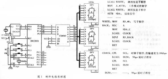 從前面的討論可以看出,DS1629兼有數(shù)字溫度傳感器和實時時鐘/日歷的功能,工作電壓為2.2~5.5V,因而可將其與單片機結(jié)合起來設(shè)計出帶有數(shù)字鐘功能的數(shù)字溫度表。單片機采用AT89C2051,封裝為20DIP,工作電壓范圍是2.7~5.5V。顯示部分采用6位數(shù)碼管來顯示時間、日期或溫度等數(shù)據(jù)。為了簡化電路,減少芯片,降低功耗,顯示部分采用動態(tài)循環(huán)掃描的方式,由一片4~7段譯碼器CD4543驅(qū)動。CD4543的工作電壓為3~18V,整個電路采用兩節(jié)干電池供電,系統(tǒng)的硬件構(gòu)成如圖1所示。圖中,DS1629的SCL與SDA端分別接單片機的P3.0和P3.1,R1和C1構(gòu)成上電自動復(fù)位電路,P3.2~P3.4接 3個按鍵,C2、C3及6MHz晶振構(gòu)成振蕩電路,P3.5、P3.7、P1.0~P1.3分別接6位數(shù)碼管的公共端(圖中3個數(shù)碼管LED2~LED4沒有畫出)作為位選信號,P1.4~P1.7接CD4543的BCD碼輸入端,6個數(shù)碼管的數(shù)據(jù)輸入端a~g都并接到CD4543的數(shù)據(jù)輸出端a~g。