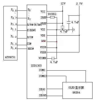 圖2 單片機(jī)AT89C51與SSD1303和顯示屏的硬件接線