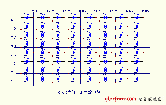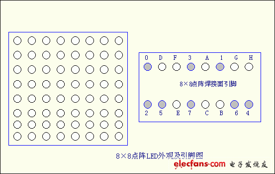 圖(1)為8×8點(diǎn)陣LED外觀及引腳圖,其等效電路如圖(2)所示,只要其對應(yīng)
