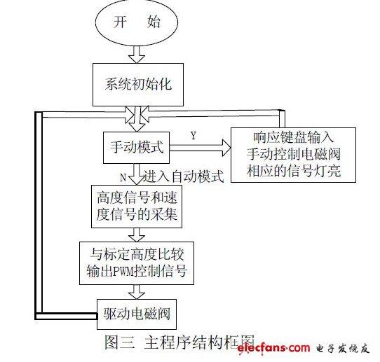 2 空氣懸架電子控制單元(ECAS)應用軟件由系統(tǒng)初始化模塊、判斷手動自動調(diào)高模塊、信號采集模塊,鍵盤響應模塊,輸出控制模塊等構成。主程序為一循環(huán)體,它擔負調(diào)節(jié)車身高度和阻尼的任務,車身高度信號經(jīng)傳