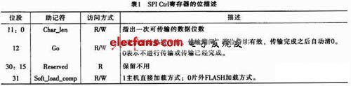 控制寄存器用來控制配置信息加載方式,即:片外FLASH加載方式或主機直接加載方式。當(dāng)選擇片外FLASH加載方式時,控制寄存器還用來控制一次數(shù)據(jù)傳輸?shù)拈L度。CTRL寄存器的具體描述見表1。