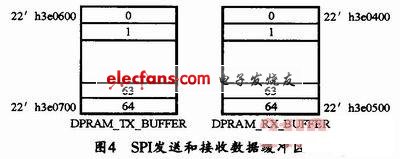 圖4所示為主機可直接訪問的SPI接口內(nèi)部DPRAM發(fā)送和接收數(shù)據(jù)緩沖區(qū)。