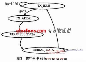 SPI_CTRL控制模塊可將發(fā)送緩沖區(qū)0的數(shù)據(jù)讀出來,經(jīng)過并串轉(zhuǎn)換,發(fā)送到串行線SI上,并且控制從串行線SO上接收數(shù)據(jù),存儲在接收緩沖區(qū),并行數(shù)據(jù)轉(zhuǎn)換成串行輸出由并串轉(zhuǎn)換狀態(tài)機來控制實現(xiàn),見圖3。