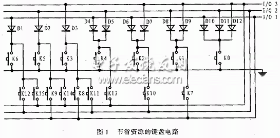 鍵盤電路是單片機應(yīng)用系統(tǒng)最常用的人機接口,往往要占用較多的I/O端口,利用本文介紹的電路,可以最大限度地減少鍵盤電路對I/O端口的點用。本電路特別適合一些引腳少、結(jié)構(gòu)緊湊的單片機,可為其節(jié)省寶貴的I/O資源。