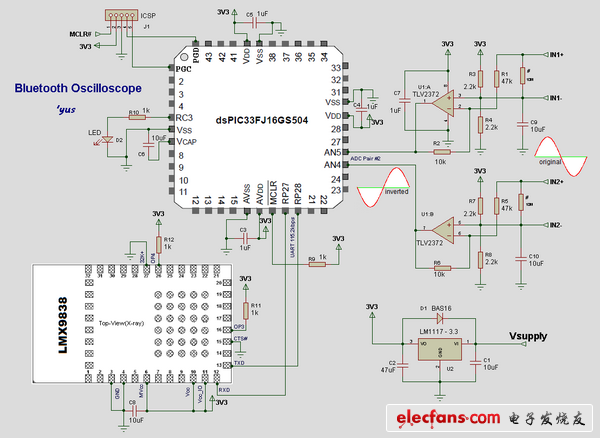 之勢。* A4 H1 K5 I( L8 x: H5 z2 m 開發(fā)人員紛紛投身Android,開發(fā)了很多精彩的應用?! ∠旅婢徒榻B一個比較新奇的應用。它利用一塊dsPIC電路采集信號,處理后通過藍牙發(fā)送給Android系統(tǒng)上的程序,將手機變身為簡易示波器。