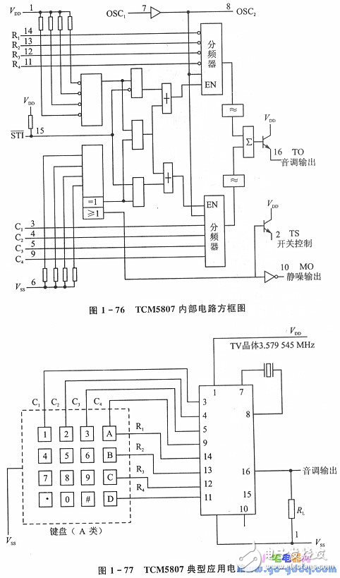 60 荷蘭飛利浦公司生產(chǎn)的單片硅柵CMOS雙音頻編碼電路PCD3311/12,不僅可為單片機控制的電話機提供多種雙音多頻組合信號,而且還可根據(jù)需要產(chǎn)生不同頻率的單音信號,或者將其編制