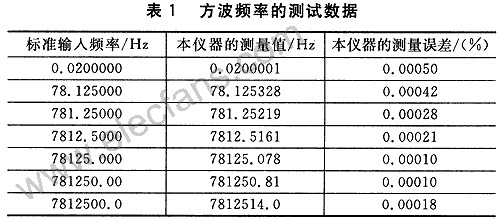 用函數(shù)信號發(fā)生器(型號為Tektronix AFG3010;精度為O.000 1%)產(chǎn)生方波信號,用設(shè)計的頻率計測出頻率,求出誤差。本測頻系統(tǒng)的測量精度可達(dá)到O.01%。根據(jù)誤差分析可知,系統(tǒng)的最大誤差發(fā)生在預(yù)置閘門時間正好填充了整數(shù)個被測信號時,即頻率為78.125 Hz或者其整數(shù)倍時,所以選擇這些點(diǎn)進(jìn)行測試。實際的測試數(shù)據(jù)如表1所列。