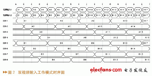 15 采用TMS320F2812實現(xiàn)視頻采集,通過XINTF接口與多片6416-HPI接口連接,實現(xiàn)圖像數(shù)據(jù)傳輸。各6416采取流水工作模式,通過EMIFB接口輸出處理后的圖像數(shù)據(jù),經(jīng)過顯示電路,由監(jiān)視器顯示輸出圖像。