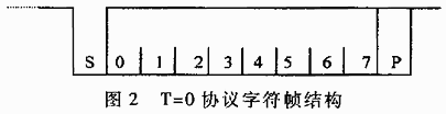 終端與智能卡之間通過(guò)改變I/O傳輸線上的電平來(lái)交換信息。由于T=0協(xié)議是面向字符的傳輸協(xié)議,這里先定義字符幀的結(jié)構(gòu),并對(duì)組成字符幀位的信息表示作了具體描述。字符幀的結(jié)構(gòu)如圖2所示。