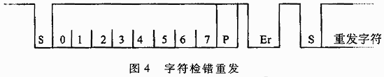如果字符接收不正確或字符接收正確但校驗(yàn)位不正確,接收端需要在字符起始位下降沿后的(10.5±0.2個(gè)etu時(shí)刻將I/O線置為低電平約1~2個(gè)etu,見(jiàn)圖4,用于向發(fā)送端指明錯(cuò)誤;發(fā)送端在(11±0.2)個(gè)etu時(shí)刻檢測(cè)I/O線。如為高電平則表示字符已經(jīng)正確接收;如果發(fā)送端檢測(cè)到錯(cuò)誤,則在檢測(cè)到錯(cuò)誤那一刻起,2個(gè)etu后重發(fā)該字符,但重復(fù)發(fā)送同一字符的次數(shù)不得超過(guò)3次。如果最后一次發(fā)送失敗,當(dāng)終端是接收端時(shí),則終端應(yīng)該在無(wú)效字符的起始位下降沿后的960個(gè)etu時(shí)間范圍內(nèi)啟動(dòng)釋放序列;當(dāng)終端是發(fā)送端時(shí),在卡片檢測(cè)到字符的偶校驗(yàn)錯(cuò)誤后960個(gè)etu時(shí)間范圍內(nèi),終端啟動(dòng)釋放序列。