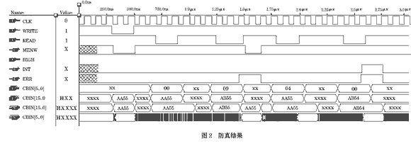 ② 數(shù)據(jù)位出現(xiàn)一位錯誤:圖2中1.25~1.65 μs模擬了數(shù)據(jù)位產(chǎn)生一位錯誤的情況。數(shù)據(jù)正確的情況下應(yīng)該是AA55,但現(xiàn)在d8位發(fā)生了錯誤,讀入的數(shù)據(jù)變?yōu)锳B55,可以看出數(shù)據(jù)已經(jīng)被自動更正為AA55;同時,ERR輸出"1"表明有錯誤發(fā)生,CBOUT輸出為23,即100011,從表 1可以看出是d8位發(fā)生了錯誤。