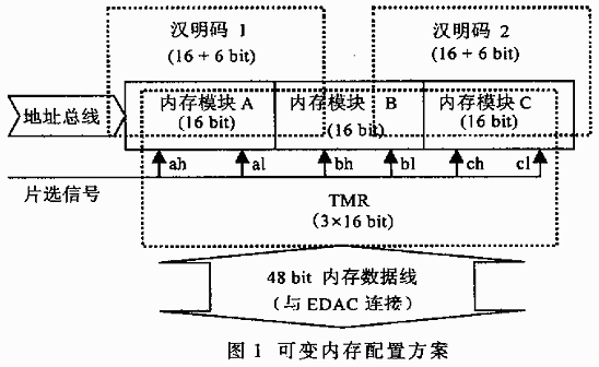 前述兩種EDAC方法對(duì)于內(nèi)存的配置是不同的。(22,16)漢明碼一般采用16bit+8bit的內(nèi)存芯片器件實(shí)現(xiàn)。而TMR則采用3×16bit的芯片實(shí)現(xiàn)。若要支持兩種方法,必須為存儲(chǔ)器設(shè)計(jì)一種特別的內(nèi)存配置方式。這是模式可變的基礎(chǔ)和關(guān)鍵。圖1為可變內(nèi)存配置方案。